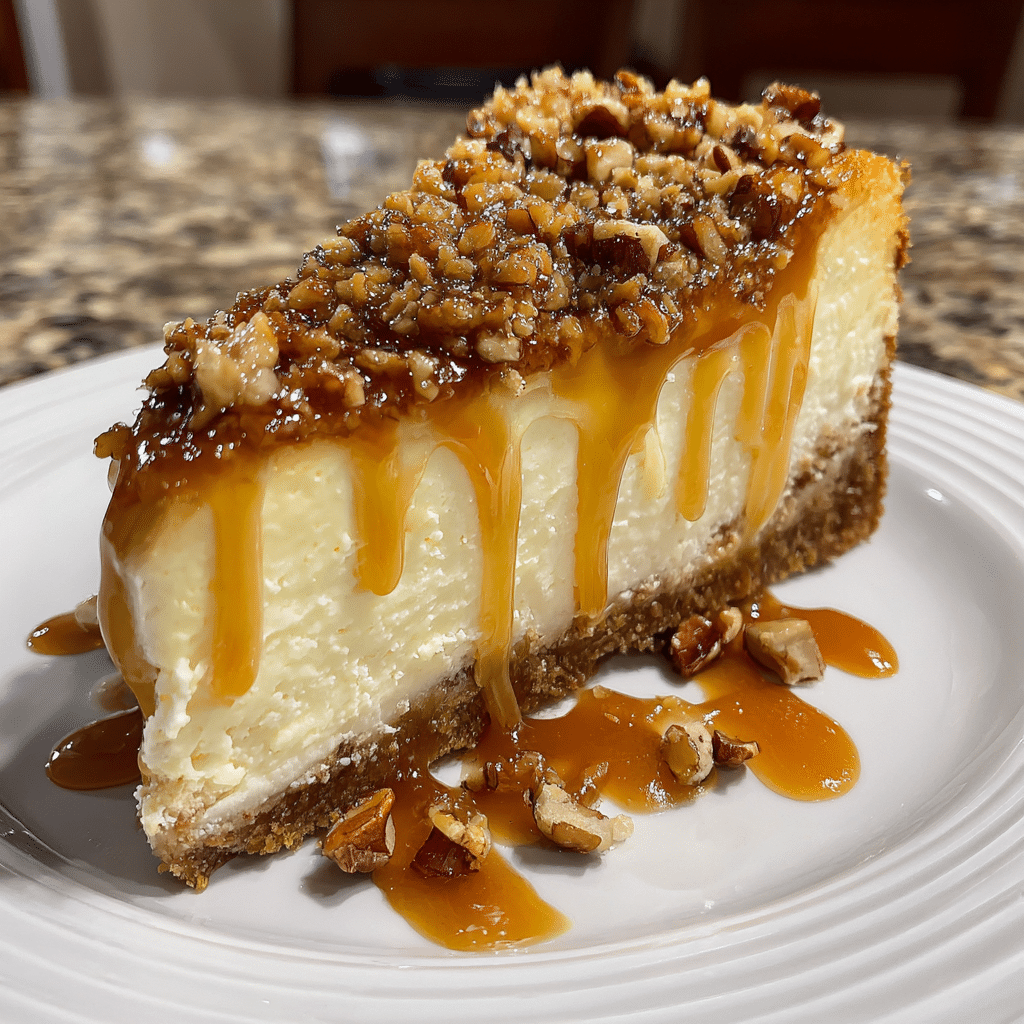 Bake for 50–60 minutes, or until the center is just set with a slight wobble. Turn off the oven and let the cheesecake cool inside with the door cracked open to prevent cracking. Once cooled, chill in the refrigerator for at least 4 hours, preferably overnight. Before serving, top with chopped nuts and a generous drizzle of caramel sauce.