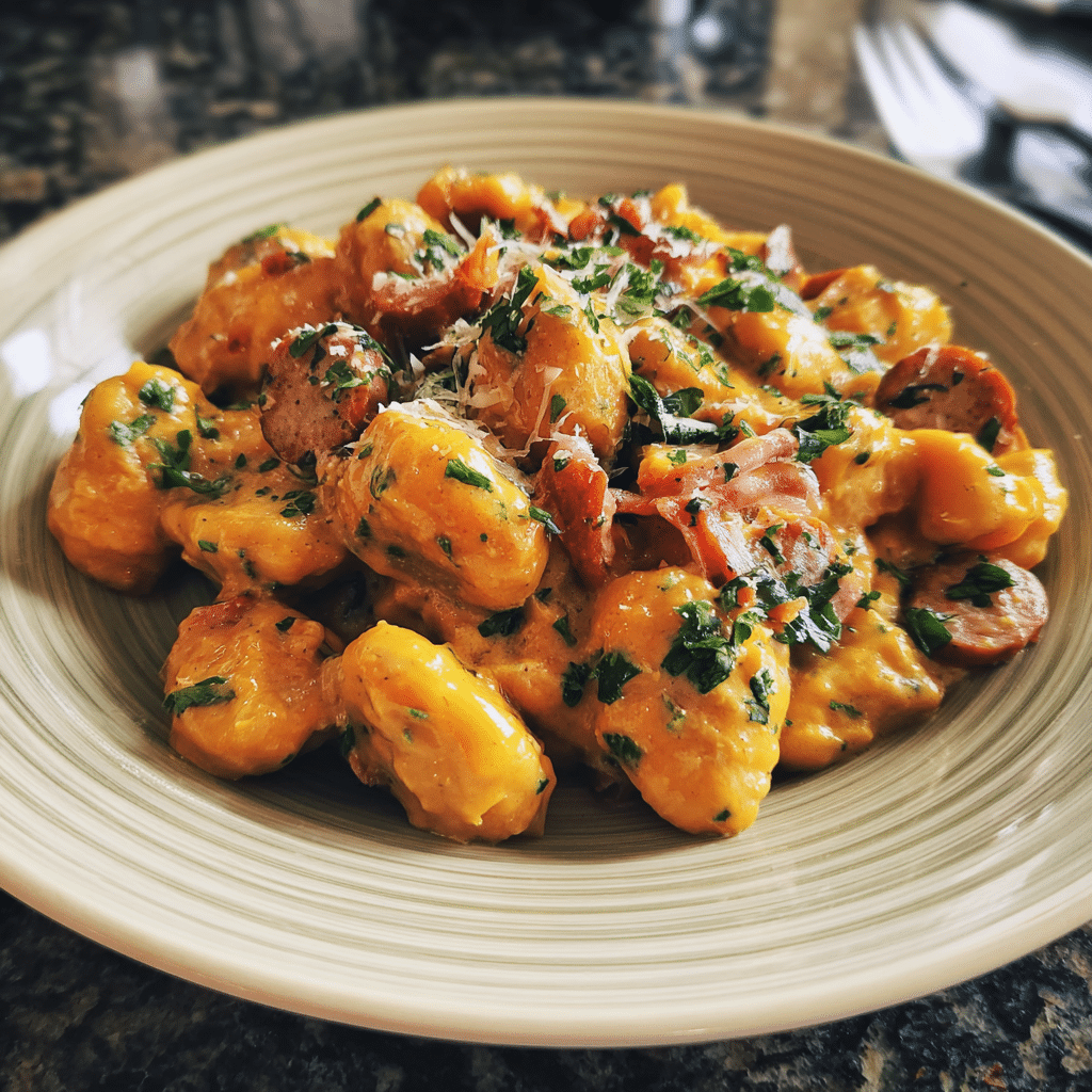 A rich and comforting pasta dish featuring pillowy gnocchi tossed in a creamy butternut squash sauce with savory Italian sausage and aromatic herbs.