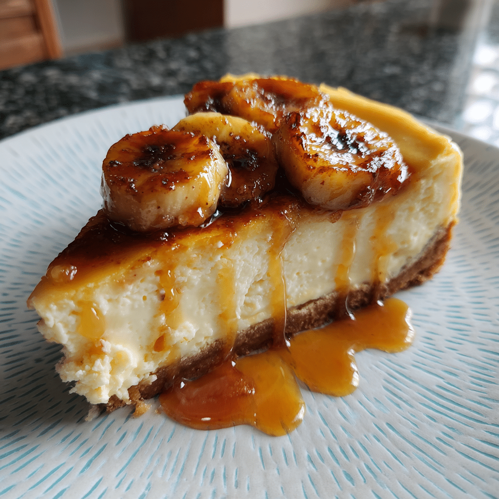 A rich and creamy vanilla cheesecake topped with sweet caramelized bananas and warm caramel sauce, creating a luxurious and elegant dessert.
