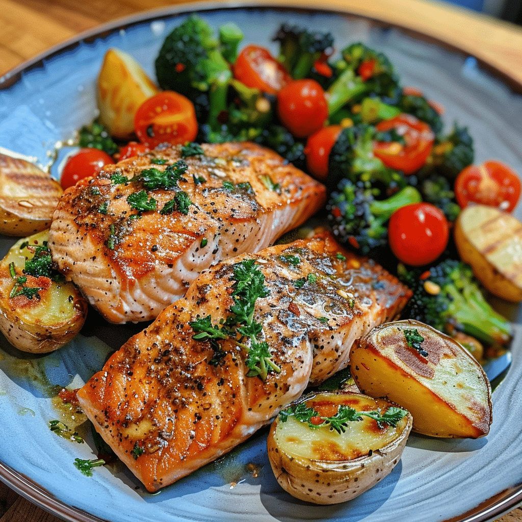 There’s something undeniably elegant yet comforting about a perfectly seared salmon fillet. When paired with crisp herb potatoes, roasted broccoli, and sweet cherry tomatoes, it becomes a complete and nourishing …