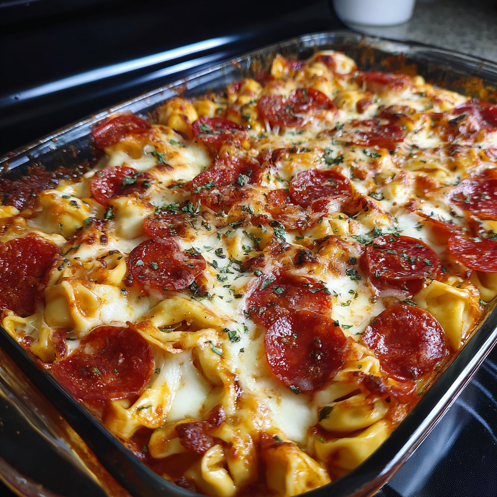 A hearty, family-friendly casserole that combines cheesy tortellini, savory pepperoni, rich marinara sauce, and melted mozzarella for all the flavors of pizza in an easy baked pasta dish.