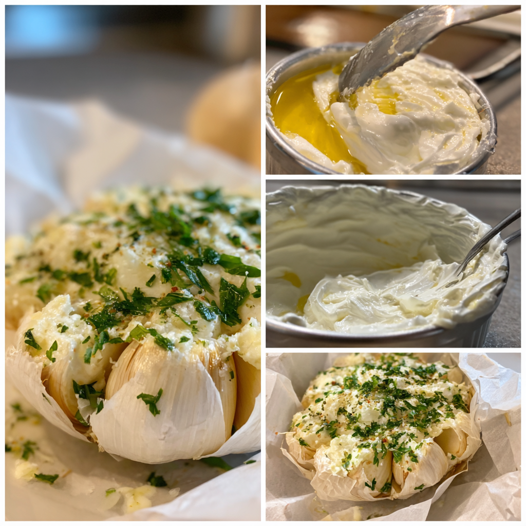 Preheat your oven to 200°C (400°F). Slice the tops off garlic heads, drizzle with olive oil, wrap in foil, and roast for 30–35 minutes until soft and golden. Allow to cool slightly.