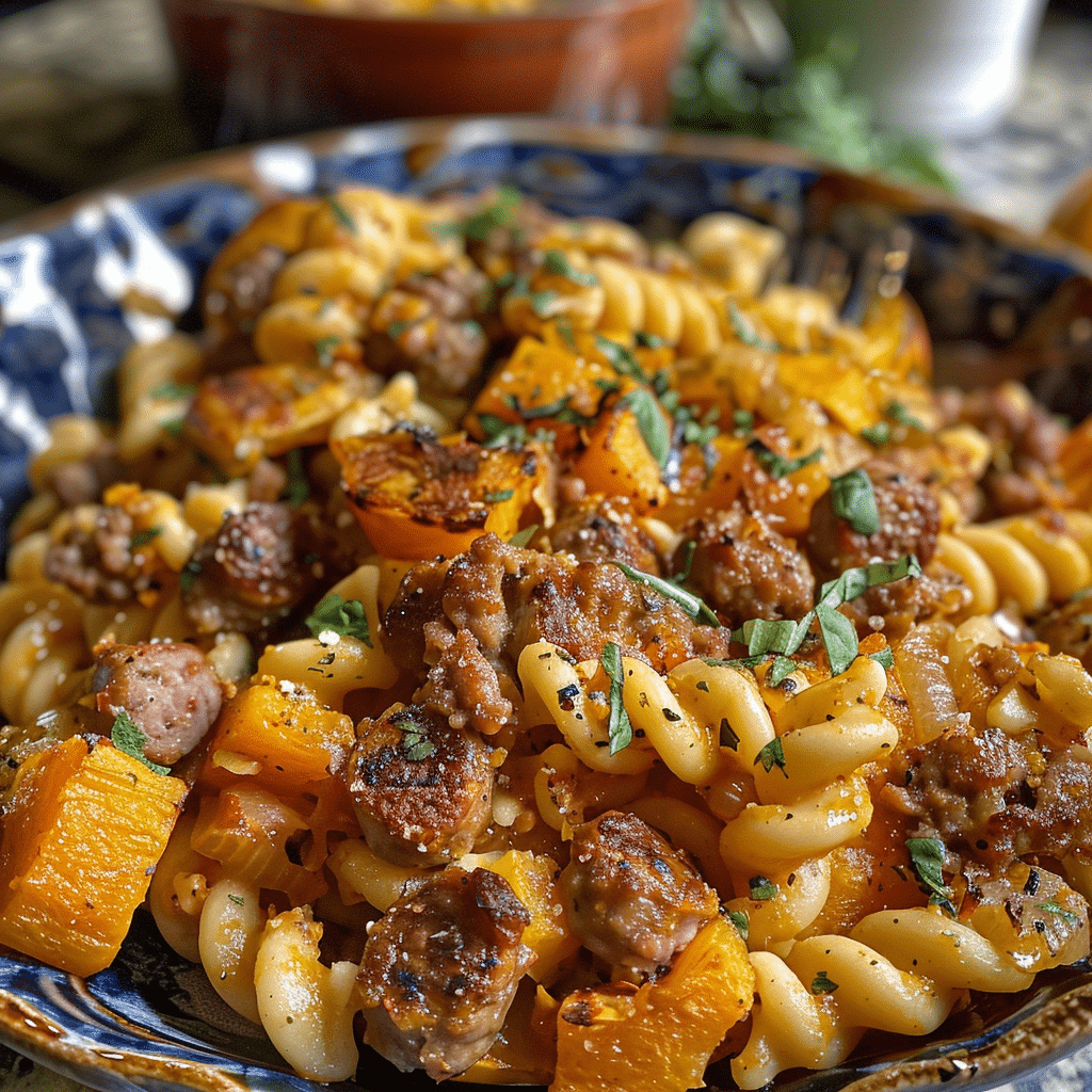 A hearty and cozy autumn dish featuring roasted butternut squash, savory sausage, and pasta tossed in a creamy sauce — perfect for a comforting fall meal.