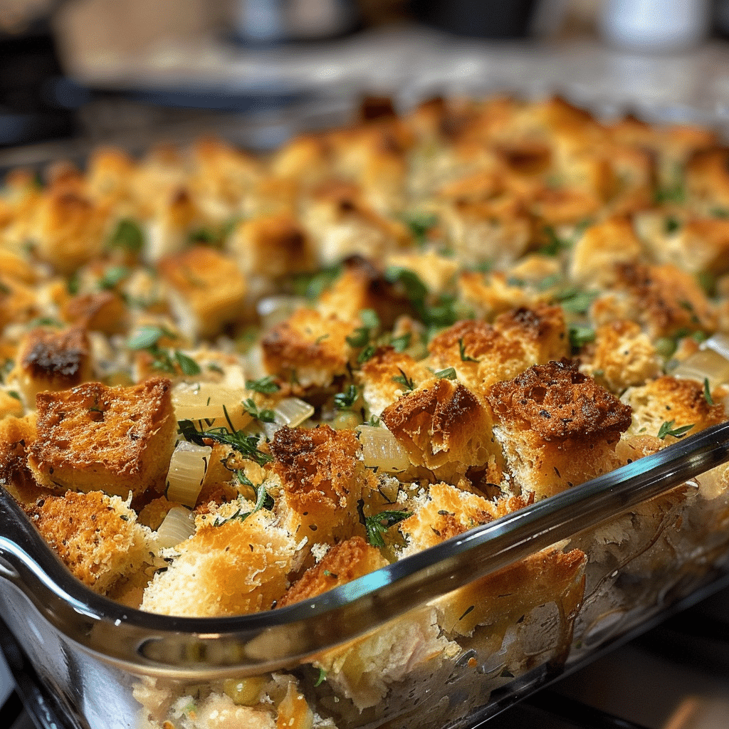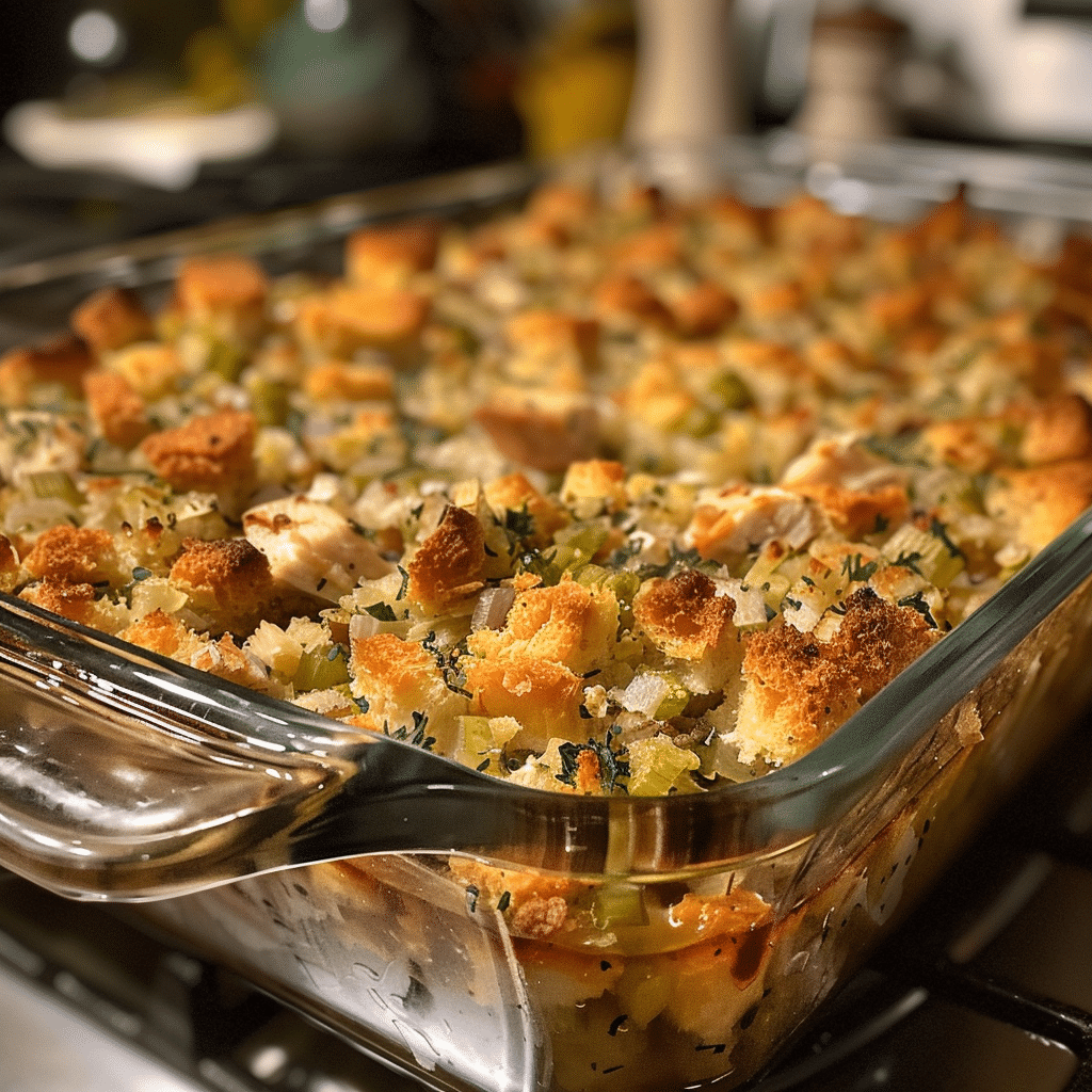 Bake uncovered for 30–35 minutes, or until the stuffing is golden brown and the casserole is bubbling at the edges.