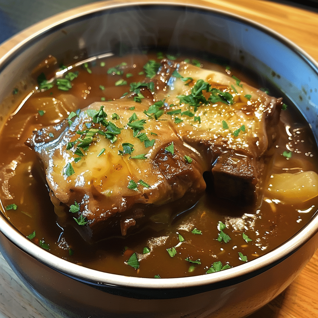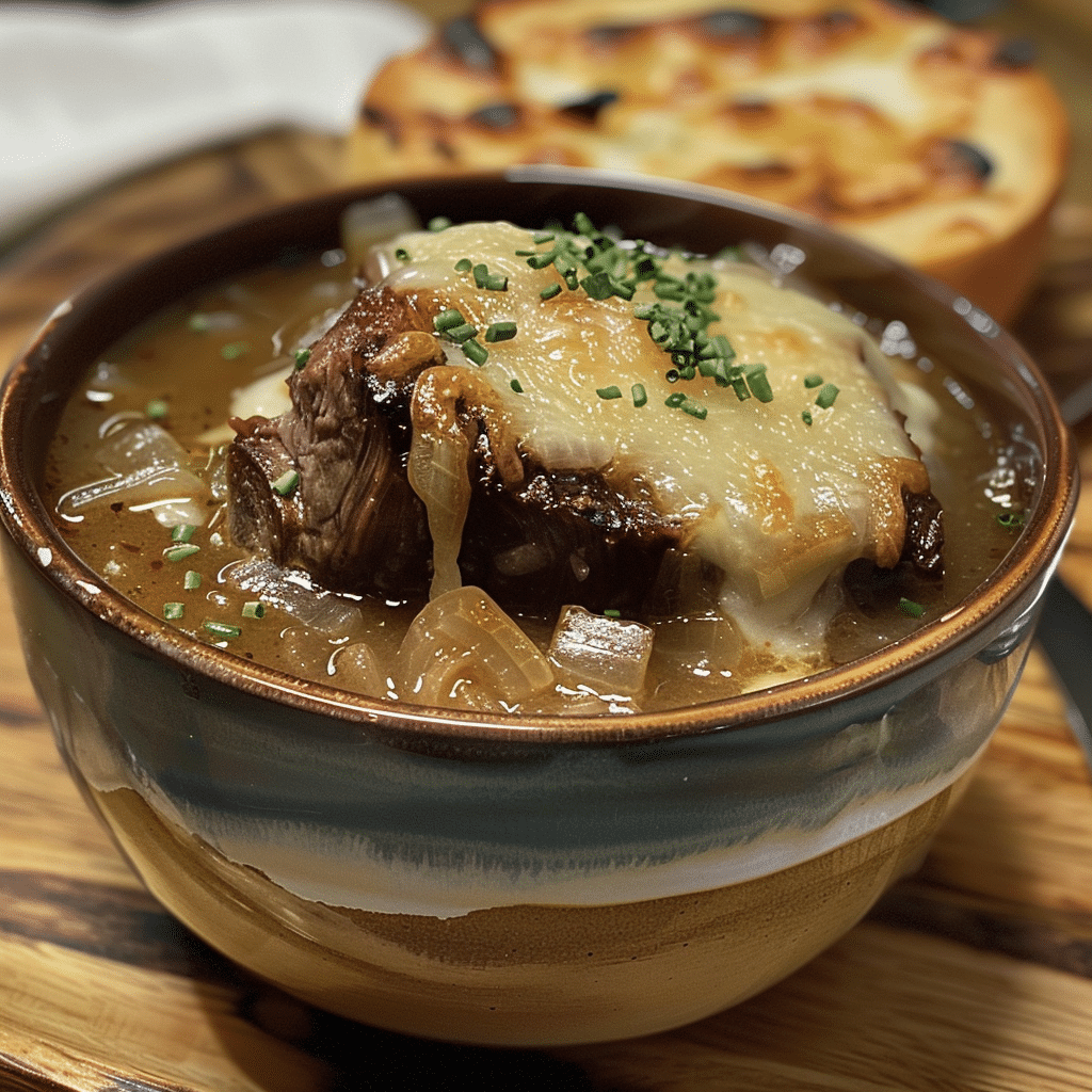 A rich and savory twist on classic French onion soup made with tender beef short ribs, caramelized onions, and a flavorful broth topped with crusty bread and melted cheese.