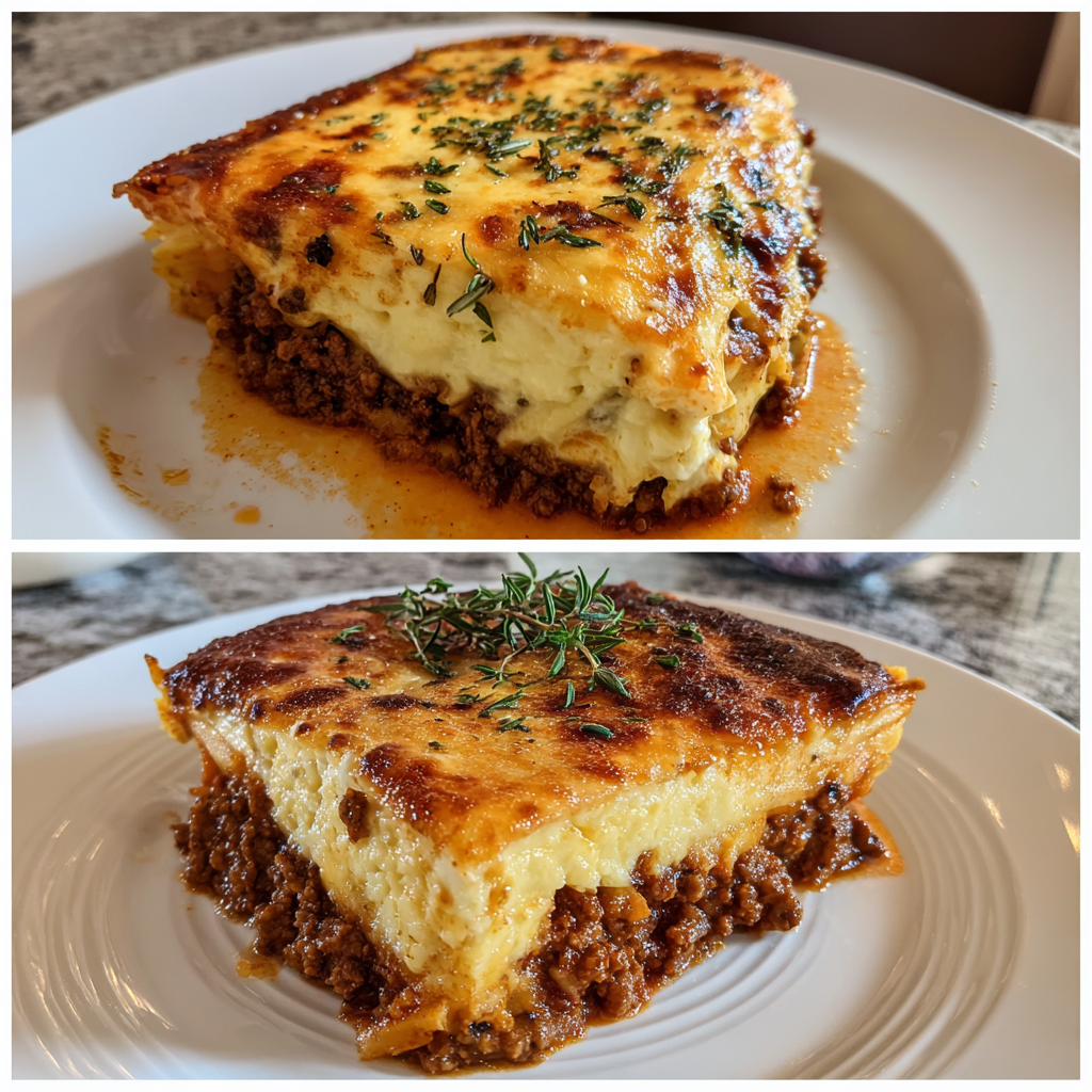A classic Greek moussaka made with layers of tender eggplant, savory spiced meat sauce, and creamy béchamel, baked until golden and comforting.