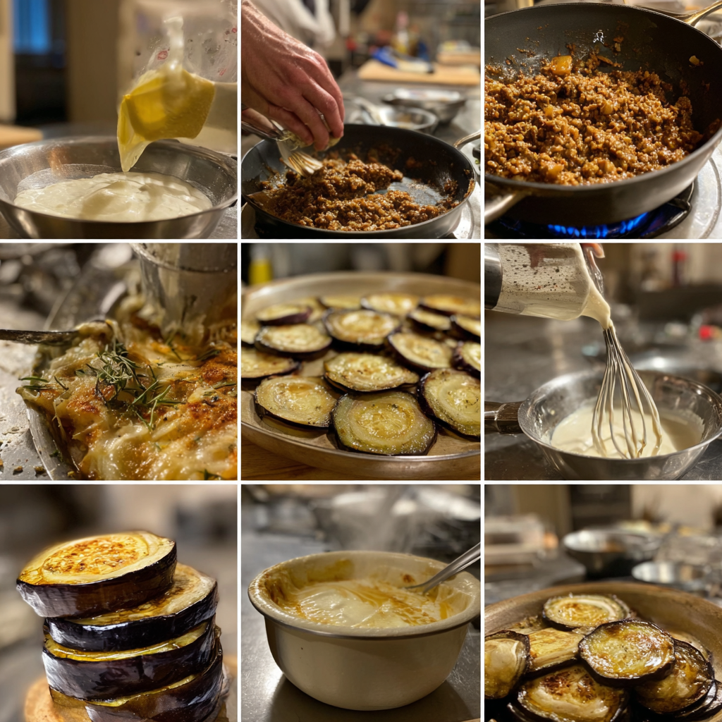 To assemble, layer the roasted eggplant in a baking dish, followed by the meat sauce. Repeat layers if desired. Spread the béchamel evenly over the top.