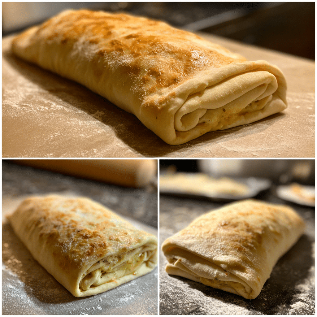 Pizza dough forms the foundation of the stromboli. It bakes into a crisp exterior while remaining soft and chewy inside.