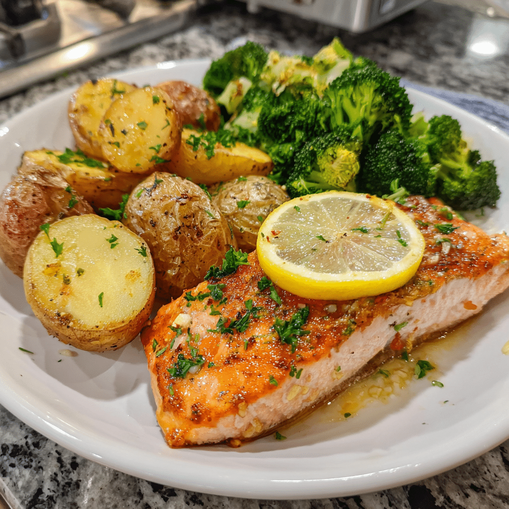 A bright and flavorful sheet-pan style meal featuring tender lemon-butter salmon, crispy golden potatoes, and roasted broccoli for a complete, easy, and healthy dinner.