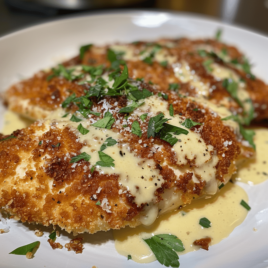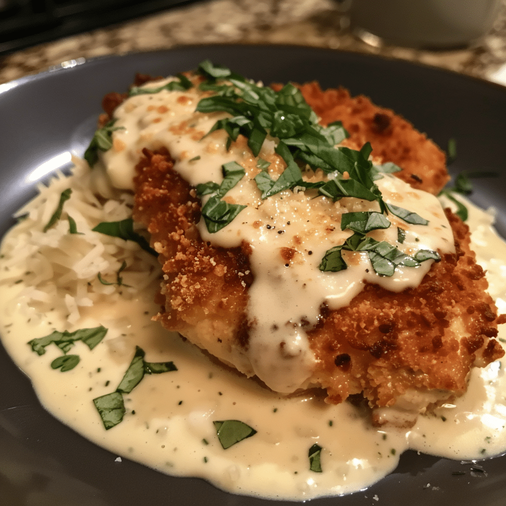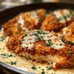 Parmesan crusted chicken with creamy sauce is a crispy, golden chicken breast coated in Parmesan cheese and breadcrumbs, served with a rich, garlicky cream sauce. It’s a comforting and flavorful dish perfect for dinner.