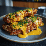 Pretzel Chicken with Mustard-Cheddar Sauce is a hearty, family-friendly dish that combines crispy, crunchy coating with creamy, tangy sauce. Instead of traditional breadcrumbs, crushed pretzels give the chicken a unique texture and salty bite. The rich mustard-cheddar sauce balances this crunch with a velvety, savory finish, turning a simple chicken dinner into something extraordinary. This recipe is perfect for weeknights because it comes together quickly, but it is also impressive enough for entertaining. The pretzel coating keeps the chicken juicy while adding an irresistible crunch, while the sauce—made with sharp cheddar cheese and zesty mustard—adds depth and indulgence. Serve it with roasted vegetables, mashed potatoes, or even a crisp green salad for a complete meal. If you love creative twists on comfort food, Pretzel Chicken with Mustard-Cheddar Sauce will quickly earn a place in your recipe collection.
