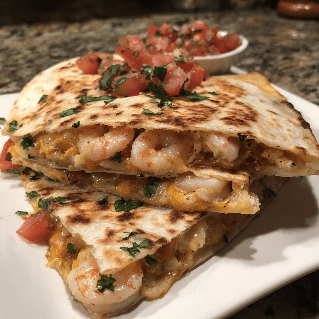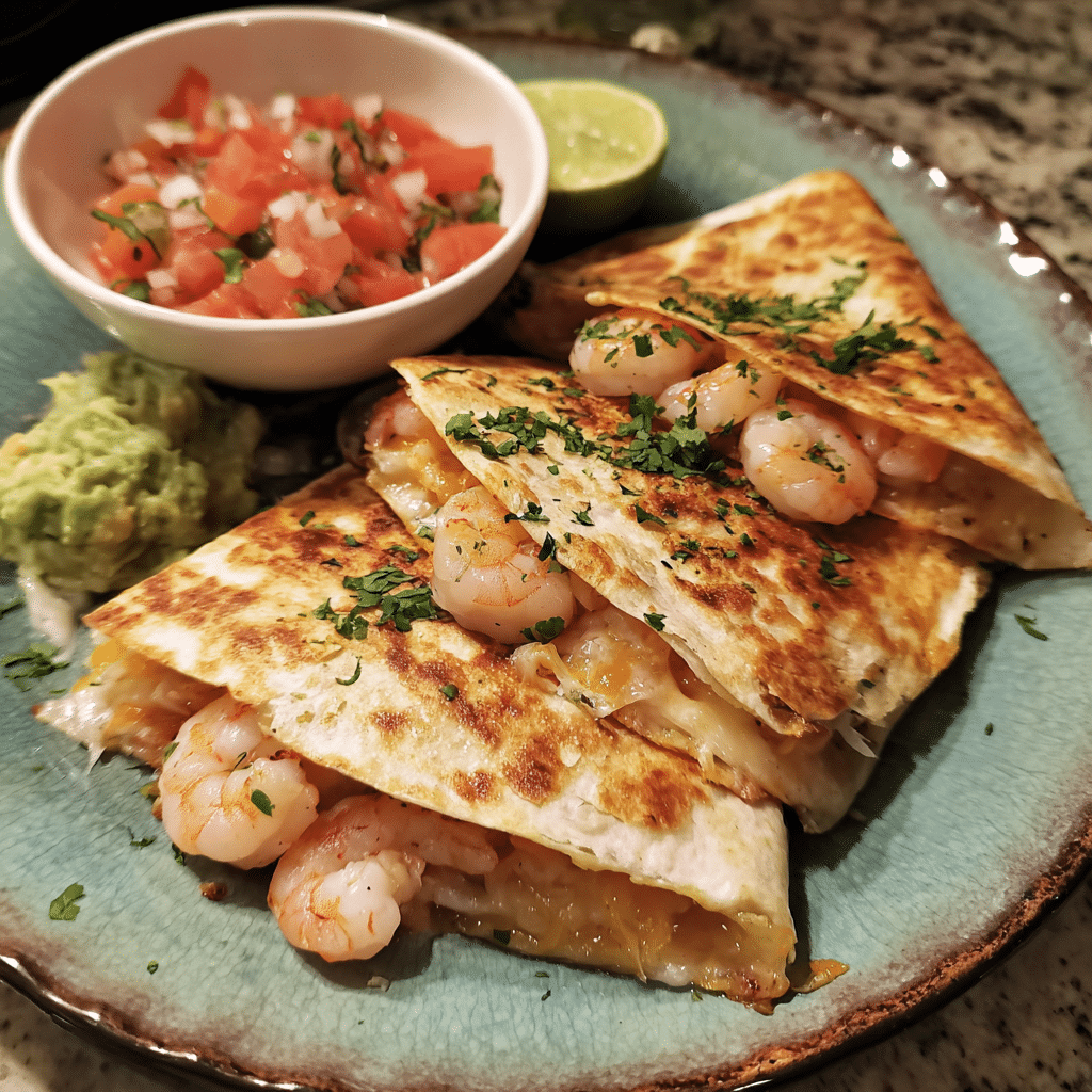 A super quick, 10-minute shrimp quesadilla recipe featuring juicy seasoned shrimp, melty cheese, and crispy tortillas for an easy, delicious meal.