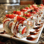 If you’re looking for a dessert that’s both adorable and delicious, this Strawberry Shortcake Sushi Roll Dessert is the perfect showstopper. Inspired by the classic Japanese sushi roll, this sweet version swaps fish for fresh strawberries, cream, and cake! It’s a playful twist on the traditional shortcake, rolled up in a soft sponge cake and filled with fluffy whipped cream and juicy strawberries. I once tried it using coconut cream and gluten-free flour, and it still turned out light, airy, and absolutely irresistible. It’s the kind of dessert that looks impressive but is surprisingly easy to make — ideal for parties, picnics, or when you simply want to treat yourself to something fun and delightful.