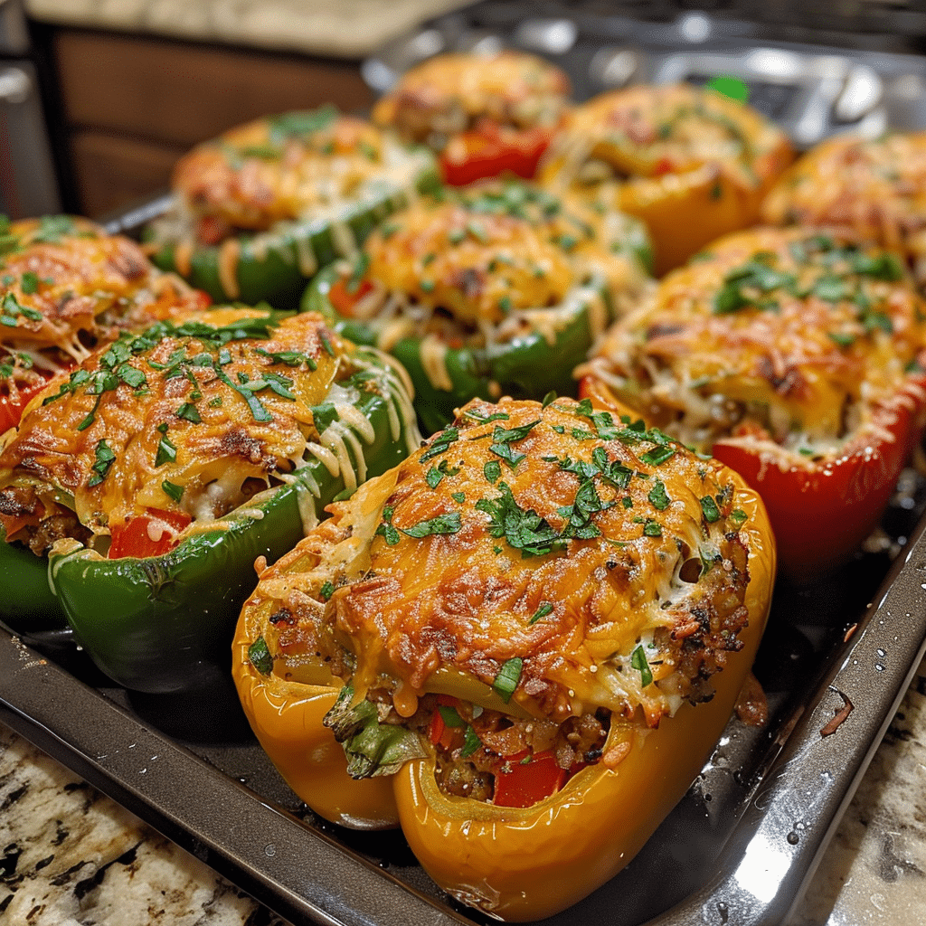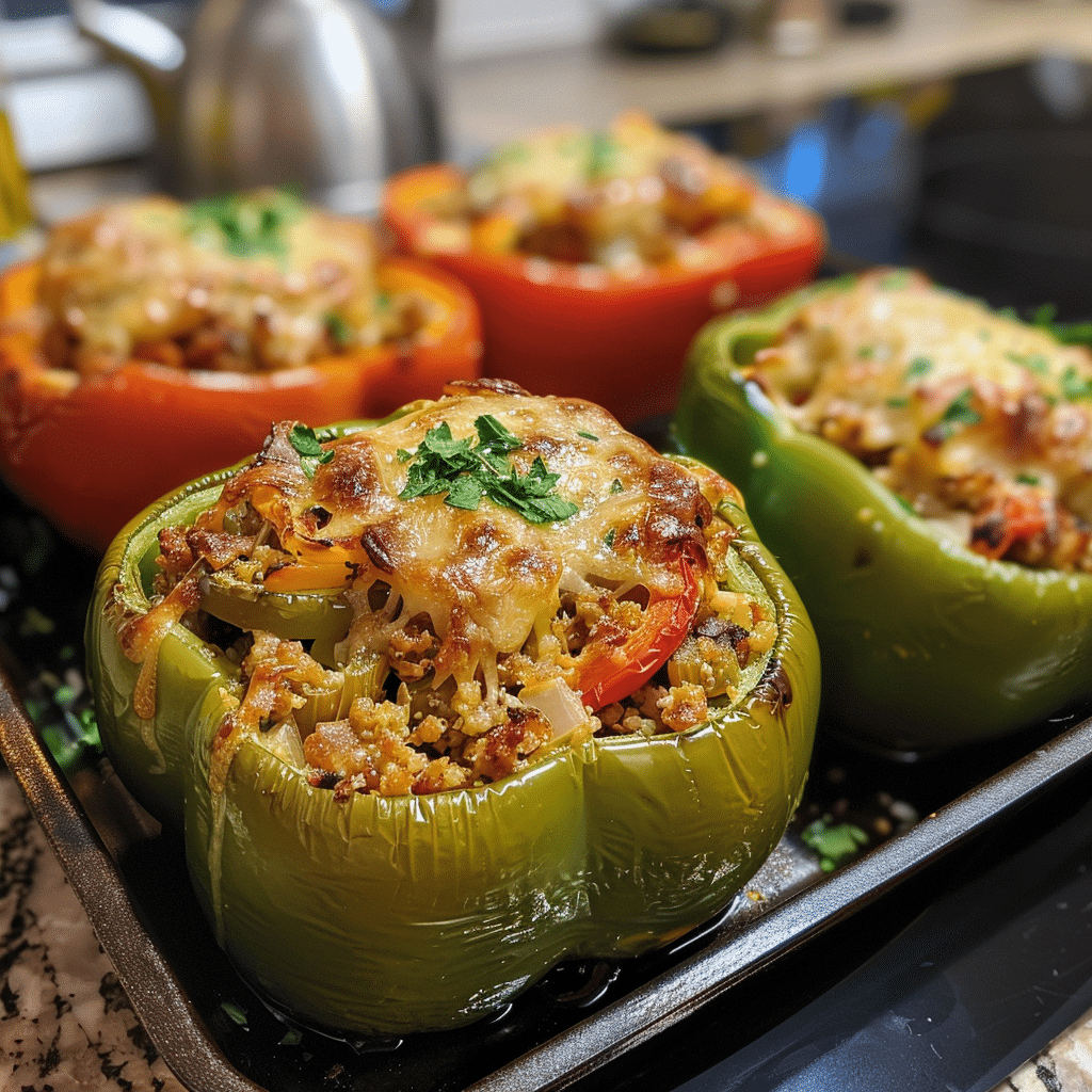 Colorful bell peppers stuffed with a hearty vegetarian filling of rice, beans, vegetables, and spices, baked until tender and topped with melted cheese.